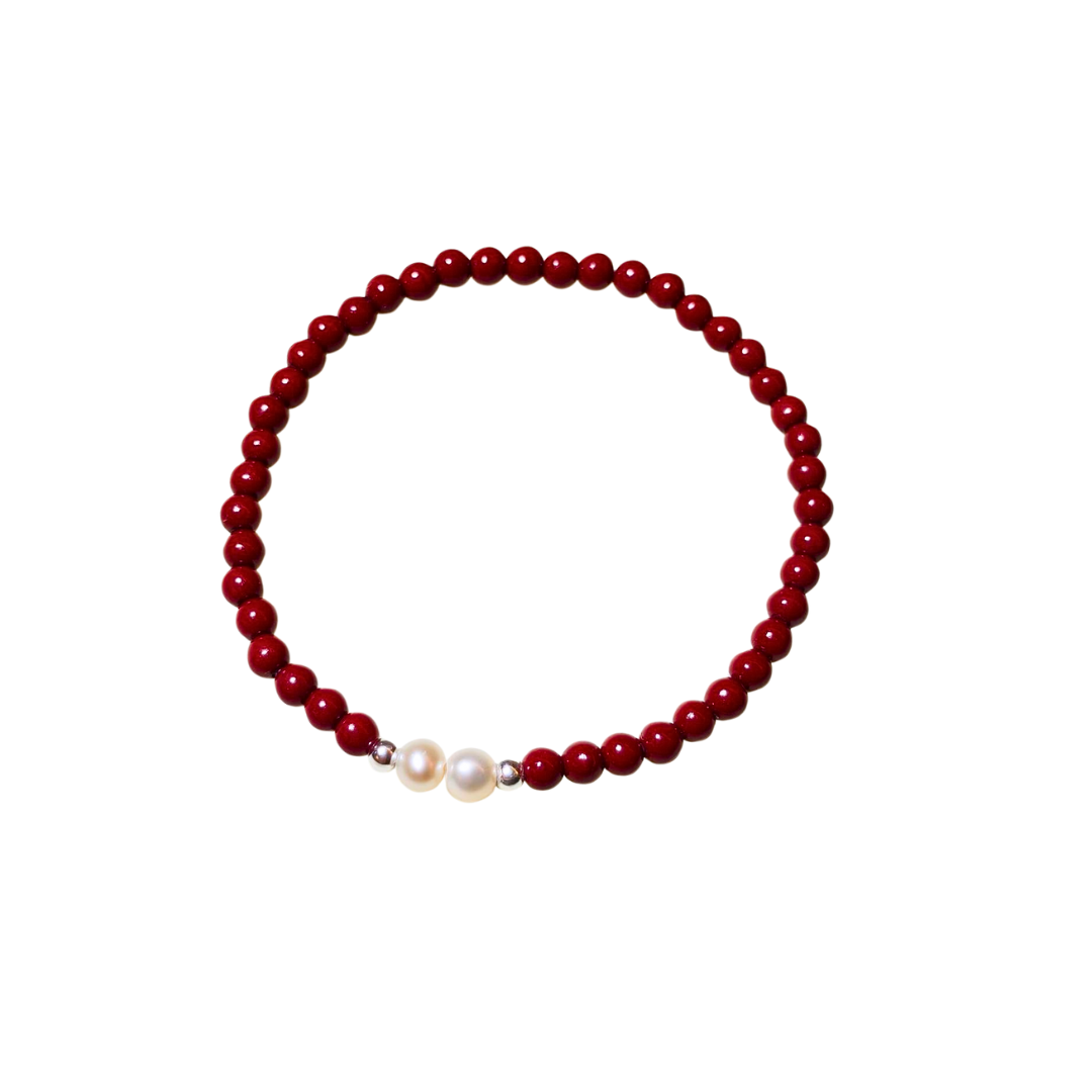 Made with vibrant red South Red Agate and accented with delicate pearl beads, this bracelet symbolizes passion and happiness. Its stretch design makes it versatile for any occasion.