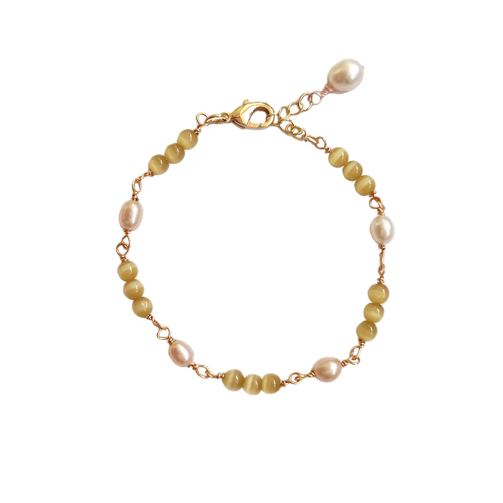 Perfect for fall, this bracelet features yellow-toned opal gemstones and light pink pearls on a 14k gold-plated chain. Use this piece of jewelry to complete your outfits this season!