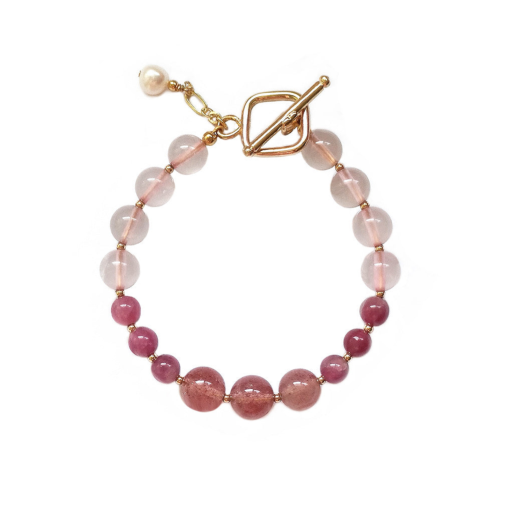 Attention pink lovers! Our Sarah bracelet is made with strawberry quartz crystals, rose quartz crystals, and pink tourmaline gemstones. Finished off with a unique 14k gold toggle clasp, this piece of jewelry is here to brighten up your day.